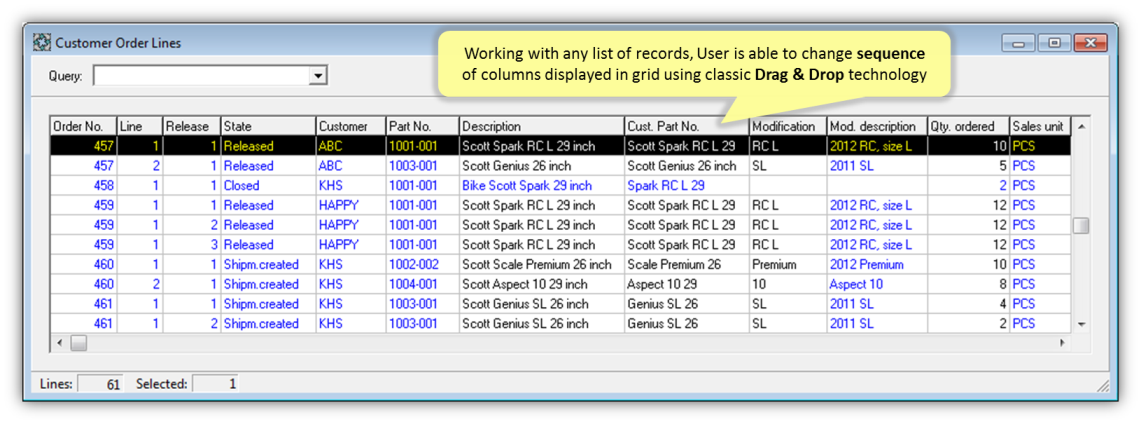 User is able to change sequence of columns for any list of records using classic Drag & Drop technology. The corresponding changes for specific list of records are User-dependent and can be used only by this User until will not be changed again.