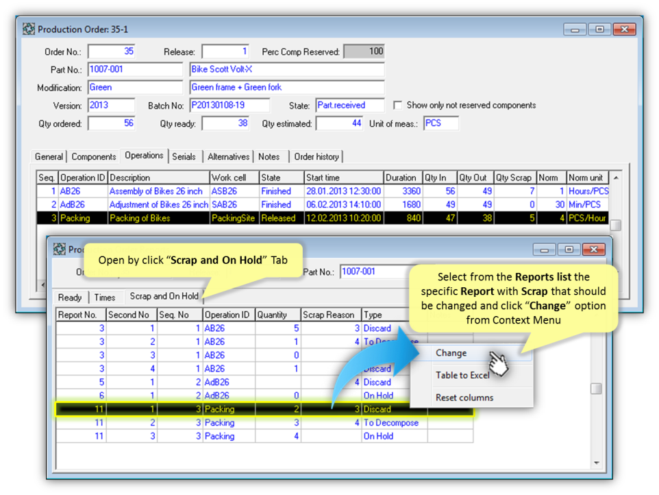 The previously reported Scrap that was produced by Production Order and CANNOT be received into Inventory can be optionally changed together with related Scrap Reason and Reaction using "Production Order Reporting" form. The changed Scrap Quantity cannot be greater than Quantity successfully handled at previous Operations taking into account the already Reported Quantity for this Production Order (including Ready Quantity, Scrap and On Hold Quantities). The last Operation will be updated with changed Scrap Quantity. The Estimated Quantity for Production Order will be updated in accordance with changed Scrap.