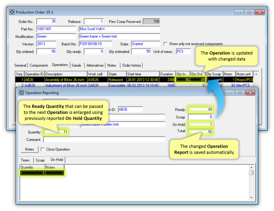 - If the specific part of previously reported On Hold Quantity is converted to the Ready Quantity that can be passed to the NEXT Operation, then this particular Operation will be updated by changed data automatically. Don't forget, that the Components assigned for Operation was already issued when the On Hold Quantity was reported.
