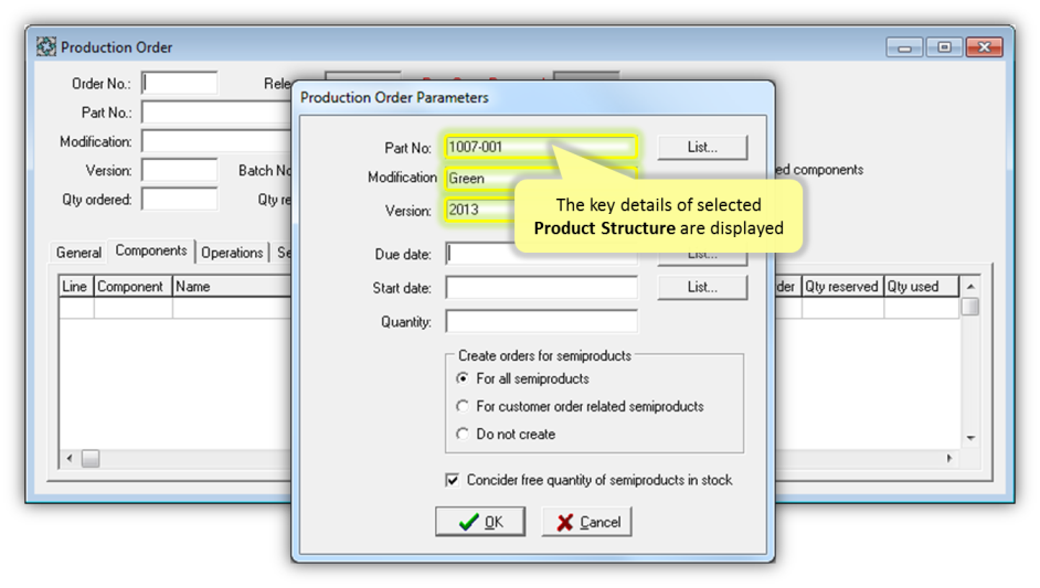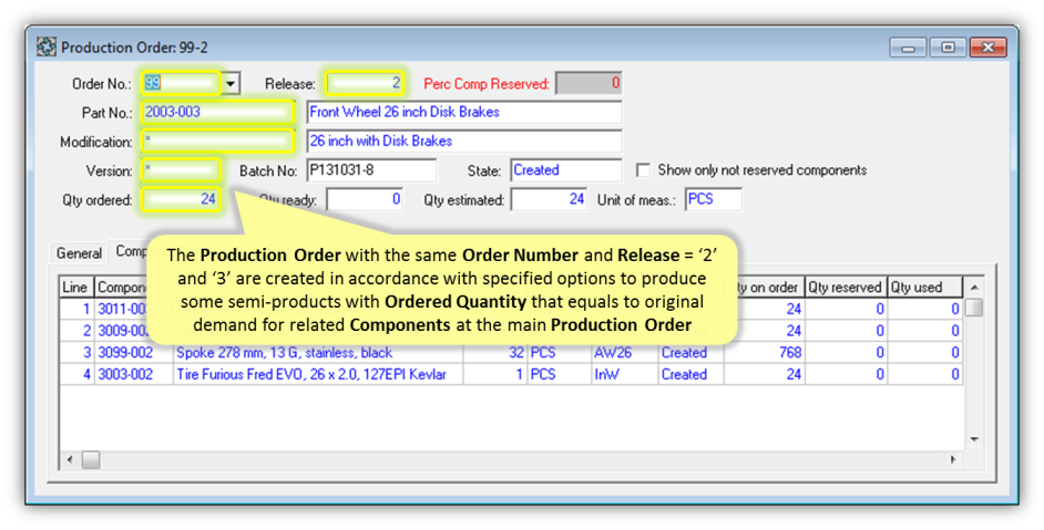 - By default, the Production Order will be created not only for explicitly selected Product Structure, but also for related semi-products (Components with own Product Structures marked by “Separate Product” Boolean flag). In such case, the new unique Order Number with Release = '1' will be generated for Production Order created for specified Inventory Part. The Production Orders for semi-products will have the SAME Order Number and Releases = '2', '3', '4' etc. If You don’t need to create Production Orders for semi-products, just switch off “Create orders for semi-products” check box.