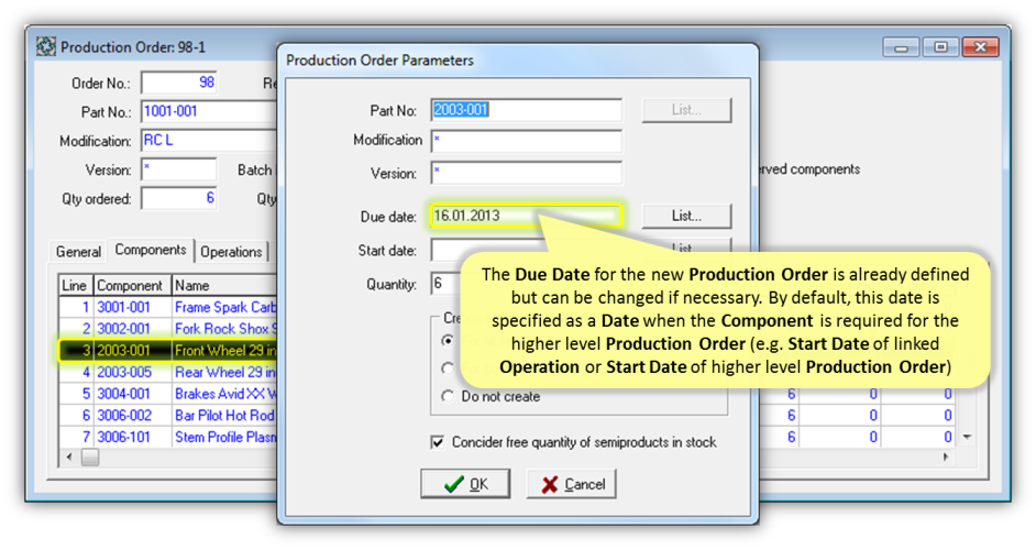 - The mandatory Due Date should be specified explicitly for the new Production Order. By default, this date is specified as a Date when the Component is required for the higher level Production Order (e.g. Start Date of linked Operation or Start Date of higher level Production Order). The Due Date can be optionally changed if necessary.