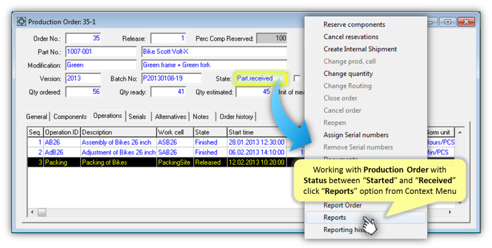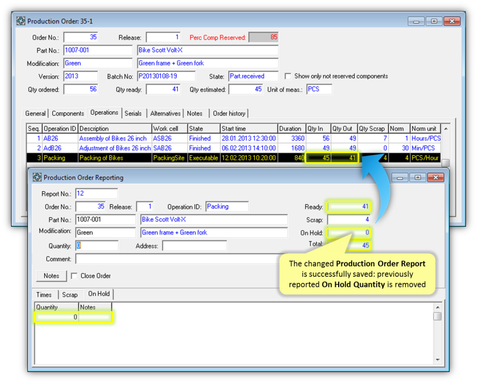 The previously reported On Hold Quantity for Production Order can be removed. The already issued Components will be returned back to the original Batches in accordance removed On Hold Quantity. The corresponding Inventory Transactions with Type = “PRODUNIS” (Undo Issue for Production Order) will be saved in the Inventory Transactions History for each returned Component. The corresponding transactions with Types "Components To WIP" with data about issued Components for previously reported and removed On Hold Quantity will be removed from Production Order Work In Progress Moves (WIP Moves) Report.