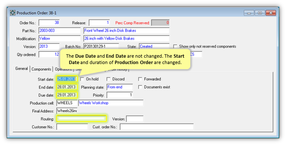 If Routing with one or more Operations is assigned for Production Order, then duration of rescheduled Production Order always depends from Ordered Quantity, number of Operations, Operation parameters and linked Work Cell Calendars. In such case, User is able to choose Start Date or End Date (together with with corresponding Planning State) to reschedule all Production Order Operations.