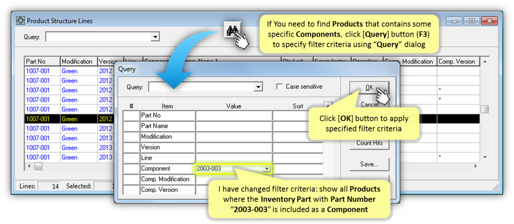 How it's possible? The answer is very easy - just go to review the Components List displayed in the "Product Structure Lines" grid using Query dialog with required filter conditions. Any details for existing Components (e.g. Part Number, Quantity per Unit with related Scrap Factor, Modification and/or Version, Operation etc.) can be changed here directly in the "Product Structure Lines" grid (if the possibility to change these details is available in the "Product Structure" details form). Moreover, You can save here any changes of Component details for different Product Structures at the same time.
