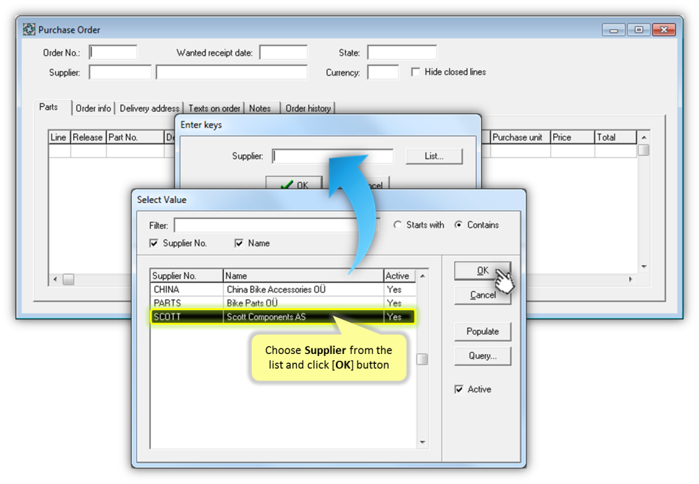 The list of ordered Inventory Parts can be registered as Order Lines list. Each Order Line can contain Part Number and Description (including Supplier specific Part Number and Description), Ordered Quantity, Purchase and Inventory Units of Measure, Unit Price in specified Currency, Wanted and Confirmed Receipt Dates etc.